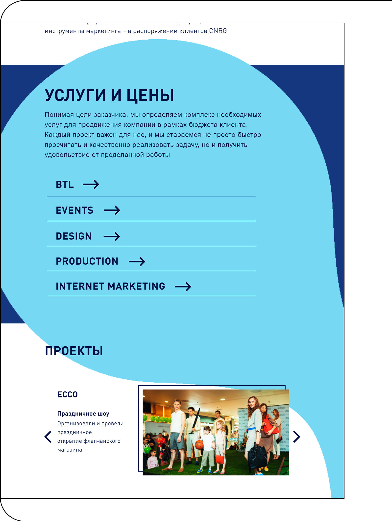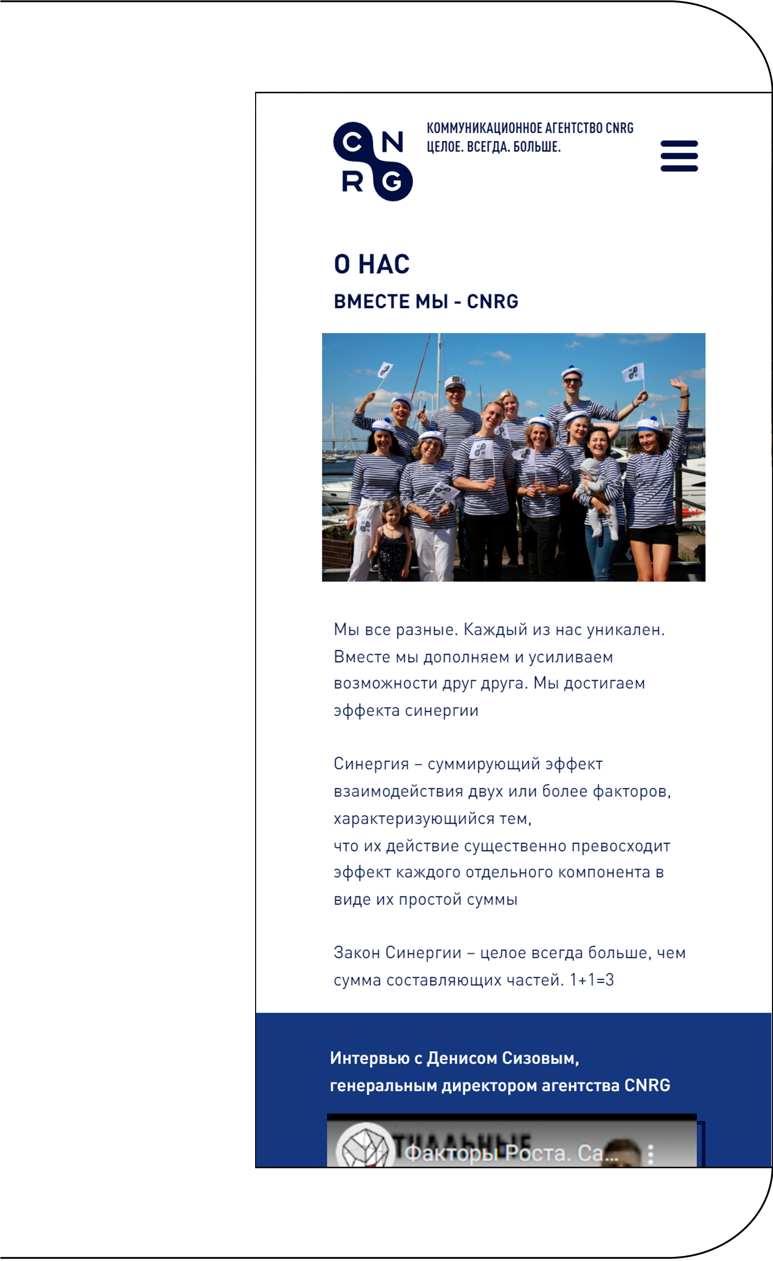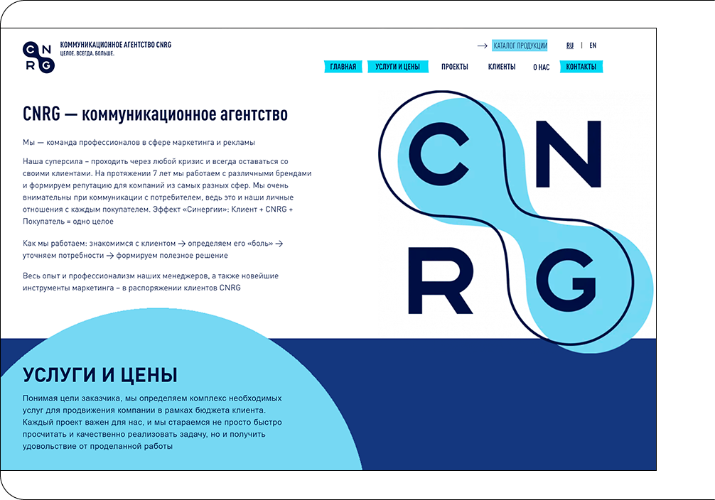 Команда профессионалов в сфере маркетинга и рекламы способна проходить через любой кризис и всегда оставаться со своими клиентами. На протяжении 7 лет они работают с различными брендами и формируют репутацию для компаний из самых разных сфер. CNRG очень внимательны при коммуникации с потребителем. Эффект «Синергии»: Клиент + CNRG + Покупатель = одно целое