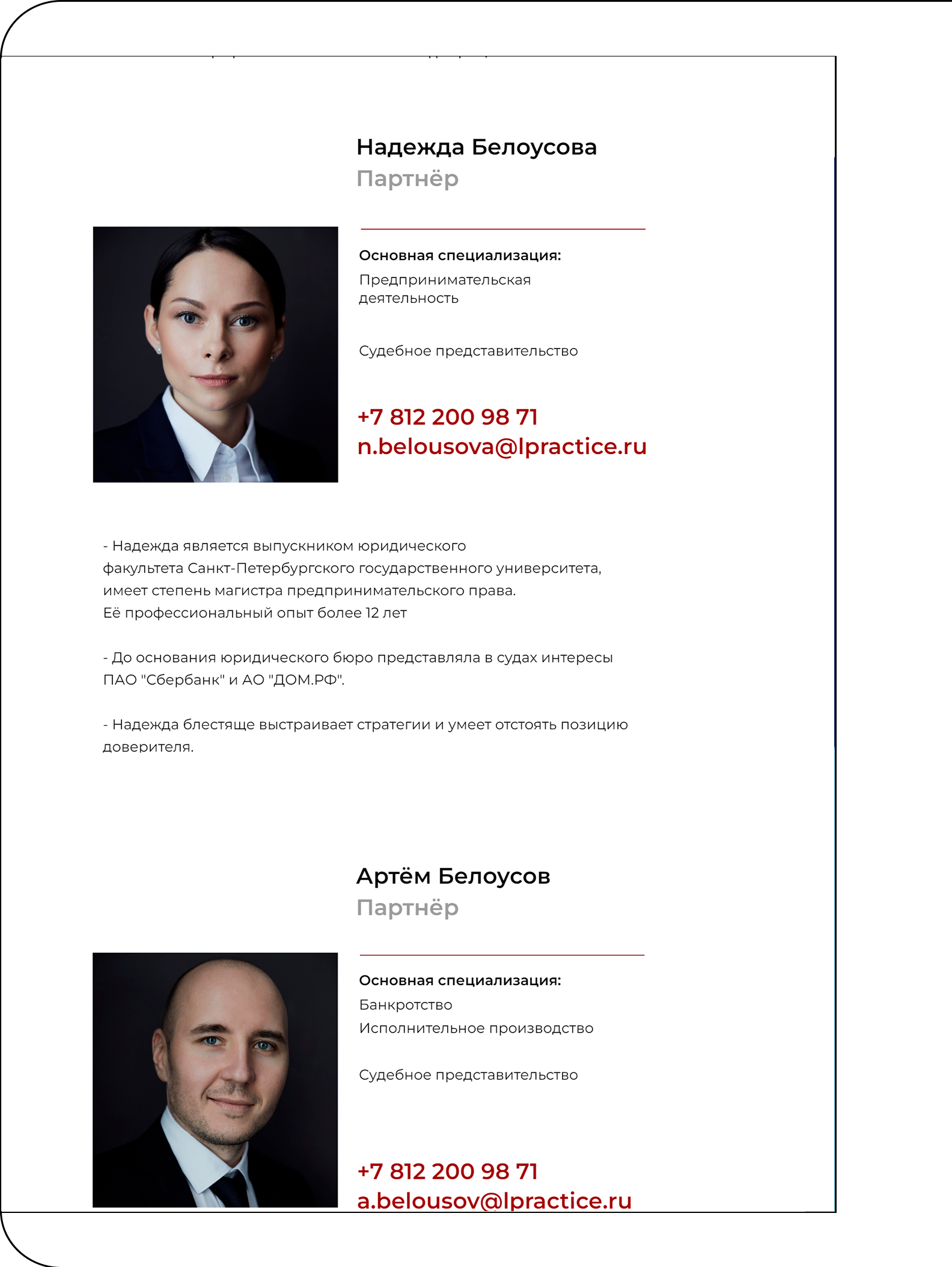 Legal Practice - юридическое бюро. Надежда и Артём Белоусовы юристы с профессиональным опытом более 12 лет. Надежда до основания юридического бюро представляла в судах интересы ПАО "Сбербанк" и АО "ДОМ.РФ". Она блестяще выстраивает стратегии и умеет отстоять позицию доверителя. Артем имеет высшее юридическое и экономическое образование. В особенность его работы входит умение гибко сочетать право и экономику. В перечень услуг компании входят: судебные споры, сопровождение бизнеса, банкротство.